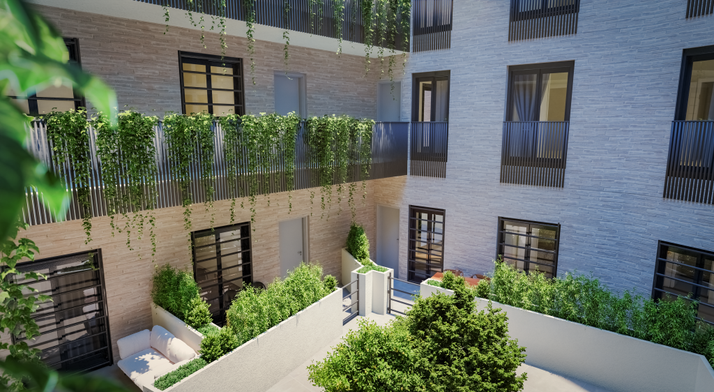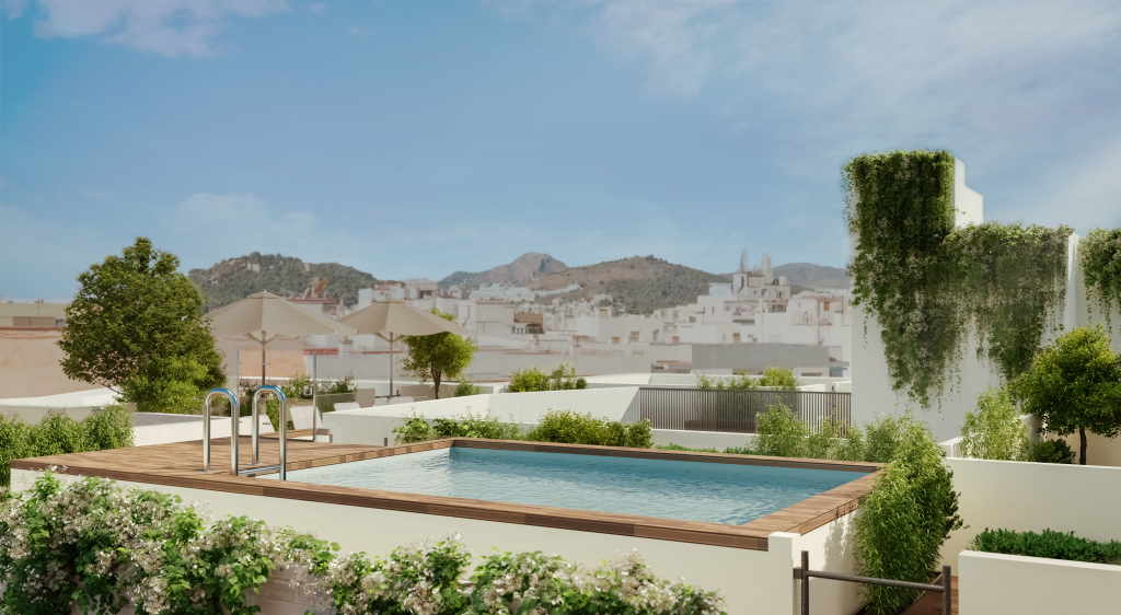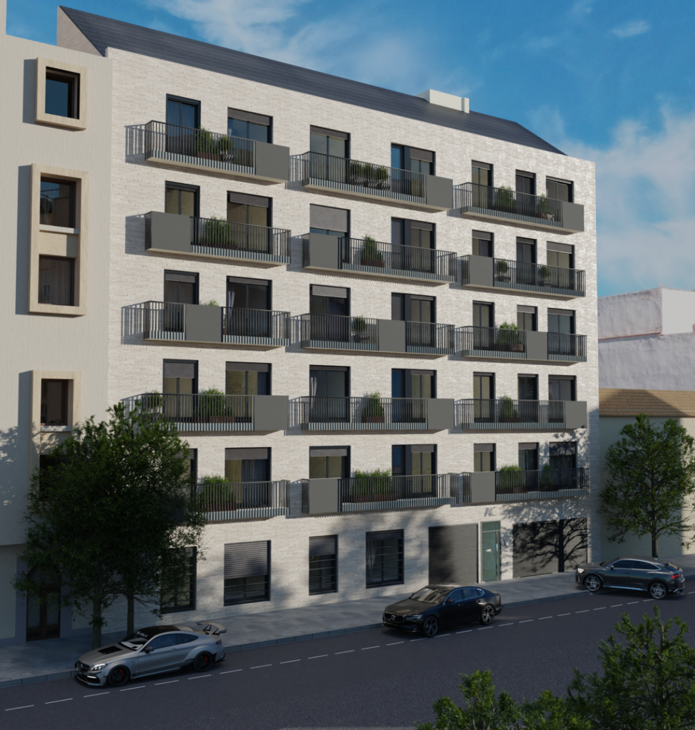 El edificio se compone de Planta Baja +5, además de Planta de Cubiertas, con una parte de la cubierta plana transitable donde se sitúa la piscina, zona de tendederos y espacio de instalaciones. Se han planteado 35 viviendas, 5 viviendas en planta baja y seis viviendas por planta. Fachadas de ladrillo cara vista, con combinaciones de mortero monocapa sobre fábrica de ladrillo perforado. Carpintería exterior de aluminio con rotura de puente térmico. Puerta de acceso a la vivienda con cerradura de seguridad. Puertas de paso practicables lacadas en blanco mate. Divisiones interiores mediante tabiquería seca de cartón yeso. Agua caliente sanitaria, mediante sistema de AEROTERMIA comunitaria. Climatización frío/calor mediante equipo de maquina interior de expansión directa.Planta cubierta plana no transitable con aislamiento interior para mayor confort acústico y térmico. La carpintería exterior de la vivienda se ha previsto en PVC. La climatización de la vivienda se compone de una red de conductos instalada en falso techo. Zonas verdes, piscina y pista de pádel
