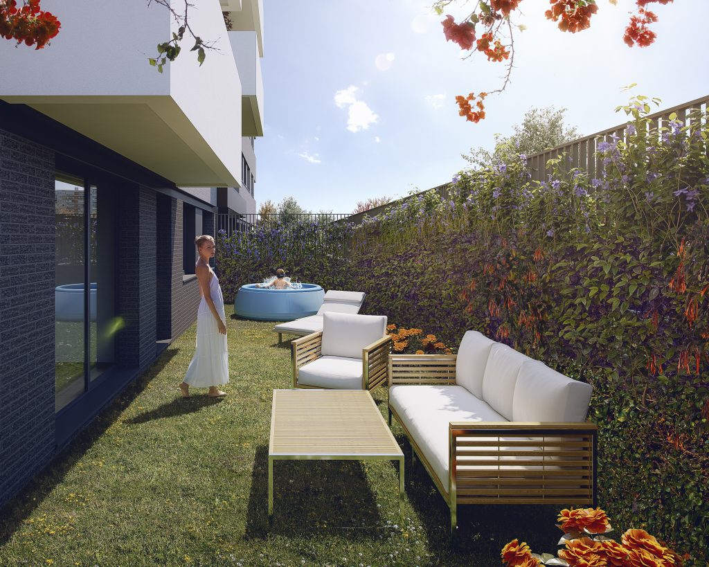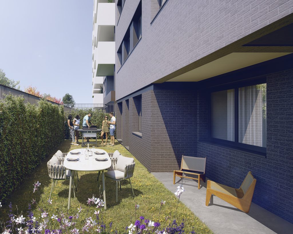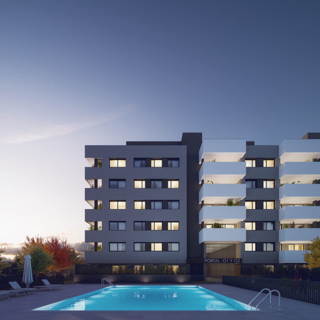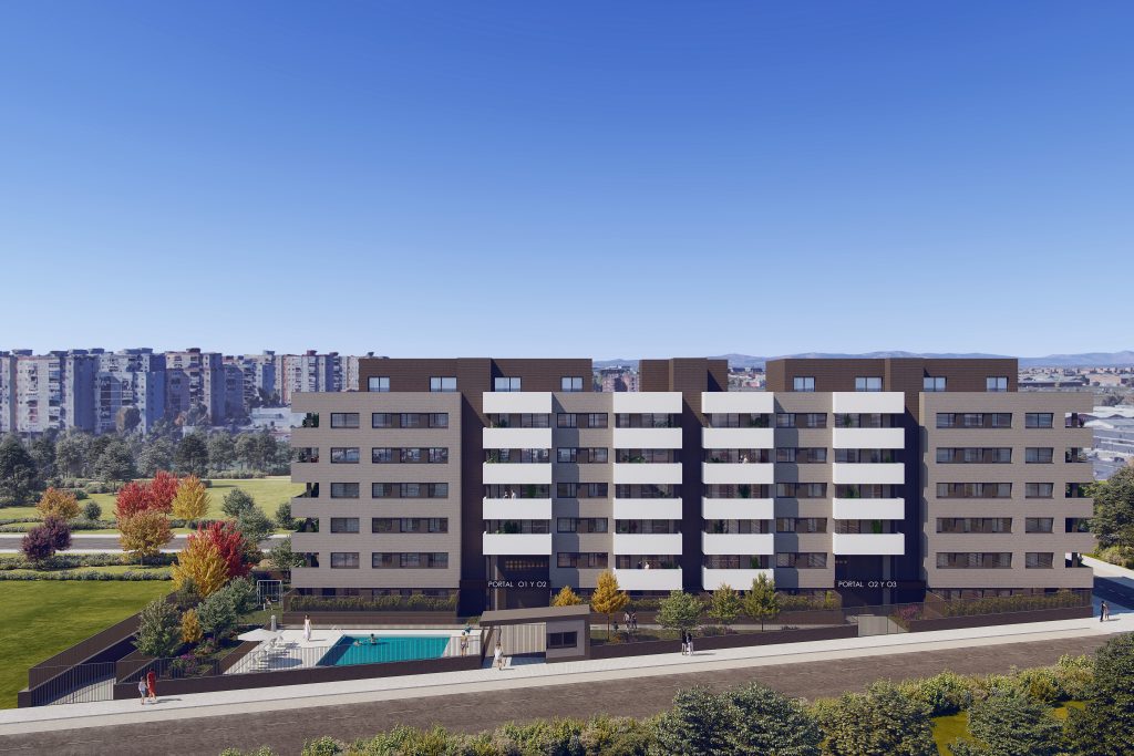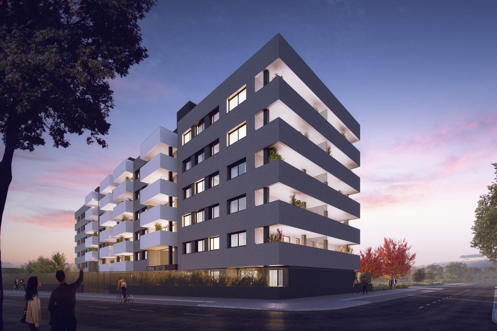 60 viviendas en tres portales y hasta seis alturas sobre rasante y dos sótanos. La fachada con ½ pie de ladrillo cara vista y con ladrillo tosco revestido con mortero. Tabiquería de placa de yeso laminado o tabique prefabricado de yeso de alta densidad. El solado de las viviendas de tarima laminada flotante. Cocina y baños con solado de gres porcelánico y alicatado con gres. Puerta de entrada a viviendas blindada con acabado lacado. Puertas de paso de viviendas DM con laminado lacado. Carpintería exterior de aluminio o de PVC. Instalación de aerotermia como sistema de producción de Climatización (calor/frío) mediante suelo radiante refrescante y Agua Caliente Sanitaria (ACS). Zonas comunes ajardinadas, área de juego infantil y piscina.